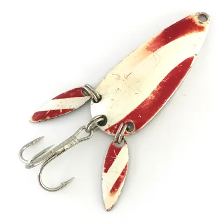Des rayures diagonales rouges et blanches offrent un motif haute visibilité sur la face de cette cuillère ondulante de 4,5 cm (1 3/4"). Le nom de la marque Marathon est estampé sur la face inférieure nickelée, marque de fabrique de cette entreprise basée au Wisconsin qui a opéré de 1929 à 1979. Ce spécimen se distingue par le code 8200, caractérisé par l'ajout de deux palettes soniques à la queue. Ces deux petites lames métalliques allongées scintillent près de l'hameçon triple, offrant un éclat supplémentaire et masquant le profil du crochet. Pesant 8g (1/4oz), le leurre est équilibré pour diverses techniques de lancer. L'état est évalué à 4/5, la peinture montrant quelques légers signes d'âge tandis que la finition nickelée sous-jacente reste brillante. L'armature solidement fixée maintient les palettes et le triple en place, préservant la configuration originale de ce matériel fabriqué aux États-Unis.