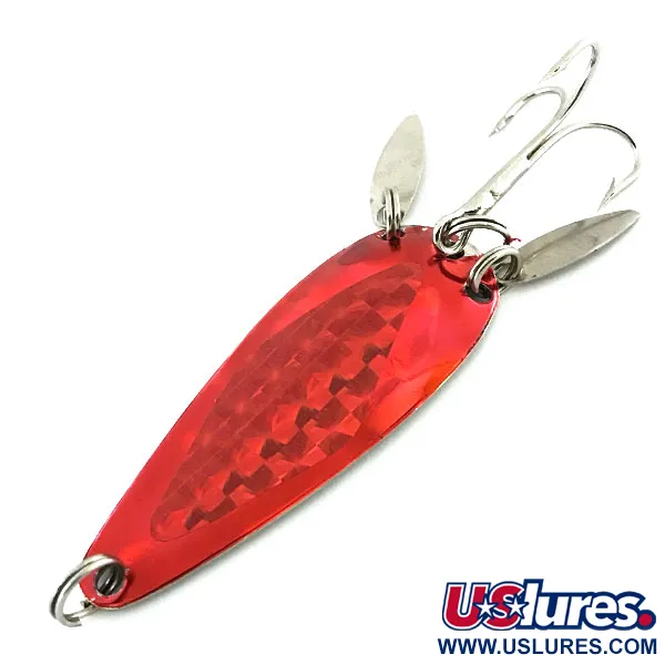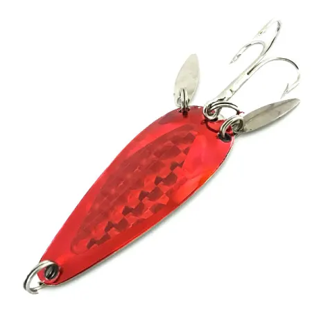 Un placage métallique rouge éclatant recouvre la surface de cette cuillère ondulante de 6 cm (2 1/4"), dotée d'un motif d'écailles texturé conçu pour capter et réfracter la lumière. Pesant 12 g (2/5 oz), ce leurre se distingue par ses deux palettes sonores argentées fixées aux anneaux brisés arrière, qui produisent des flashs visuels et imitent le mouvement de la queue d'un poisson fourrage. Ce modèle, portant le code produit 8645, a été fabriqué par la Marathon Bait Company du Wisconsin, en activité entre 1929 et 1979. L'armement, comprenant l'hameçon triple piquant et l'anneau brisé de tête, ne présente aucun signe d'usure, justifiant une note de condition de 5/5. Ces petites palettes de type feuille de saule servent également à masquer partiellement l'hameçon des poissons méfiants. La forme en goutte d'eau du corps principal est légèrement concave pour favoriser le déplacement d'eau lors d'une récupération linéaire.