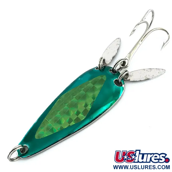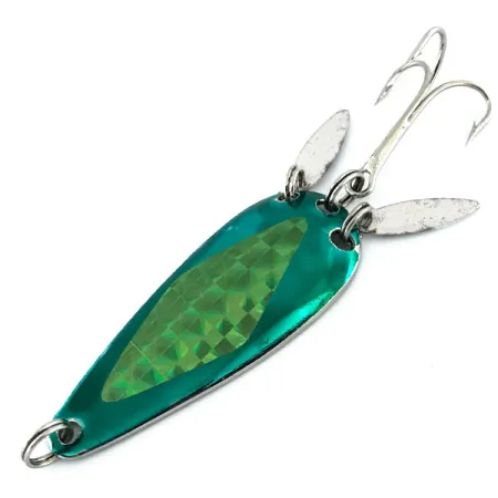 Deux « sonic blades » argentées en forme de feuille de saule sont montées à l'arrière de cette cuiller de 6 cm (2 1/4"), un élément de conception emblématique de la Marathon Bait Company. Identifié par le code produit 9023, ce leurre de 12 g (2/5 oz) présente une face vert sarcelle éclatante avec une bande holographique intégrée à motif de diamant. Ce spécimen particulier reflète l'héritage de fabrication de l'entreprise basée dans le Wisconsin qui a produit des articles de pêche de 1929 à 1979. Le verso est fini par un nickelage brillant, et l'état général est noté 5/5. Ces palettes supplémentaires produisent un éclat scintillant destiné à simuler le mouvement de la queue d'un poisson fourrage tout en masquant l'hameçon triple. L'armature reste solide, avec les anneaux brisés d'origine fixant les palettes et l'hameçon au corps en forme de larme.