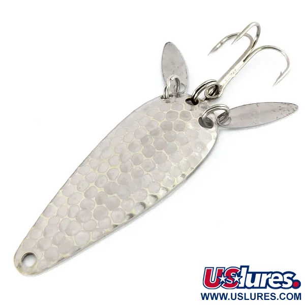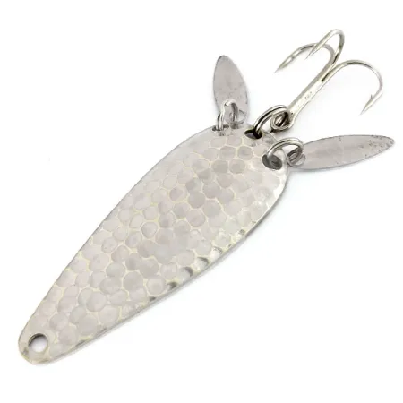 Le nickel martelé offre une surface alvéolée à cette cuillère de 12g (2/5oz), conçue pour capturer et diffuser la lumière d'une manière que les surfaces métalliques lisses ne peuvent pas égaler. Produit par la Marathon Bait Company, qui a exercé ses activités dans le Wisconsin de 1929 à 1979, ce modèle spécifique 9910 mesure 6 cm (2 1/4"). Une caractéristique technique déterminante est la paire de petites palettes sonores allongées fixées aux anneaux brisés près de la queue. Ces palettes ont un double objectif : elles masquent partiellement l'hameçon triple piquant et créent des flashs visuels secondaires destinés à imiter le mouvement de la queue d'un poisson fourrage. Le côté concave comporte un marquage "MARATHON" net, identifiant son origine de l'un des fabricants de matériel de pêche les plus prolifiques du Midwest au milieu du siècle. Ce spécimen est dans un état 5/5, conservant une finition brillante et propre sur le corps principal et les accessoires. Le profil en forme de goutte et la répartition du poids sont adaptés aux techniques de lancer ou de traîne nécessitant une silhouette métallique.