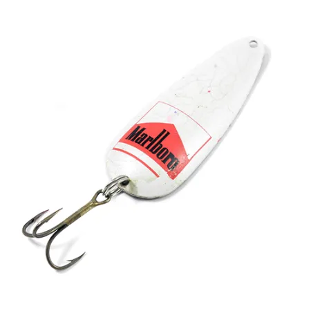 Un profil classique de 7 cm définit cette cuillère en métal estampé, qui constitue un objet de collection unique lié au tabac. Fabriqué à l'origine aux USA, cet article portant le code 1964 présente une finition Perle blanche sur la face convexe dominée par l'emblématique logo rouge Marlboro. Le revers révèle un placage nickel contrasté, offrant l'éclat nécessaire attendu d'une cuillère traditionnelle. Avec un poids de 16 g, elle est suffisamment solide pour diverses applications de lancer ou de traîne. L'armement comprend un hameçon triple de style vintage fixé par un anneau brisé robuste à la queue. Le leurre est en état 3/5, affichant une usure authentique de la peinture et du métal qui souligne son histoire au bord de l'eau. Un point d'attache unique à la tête permet un montage facile sur votre ligne ou bas de ligne.