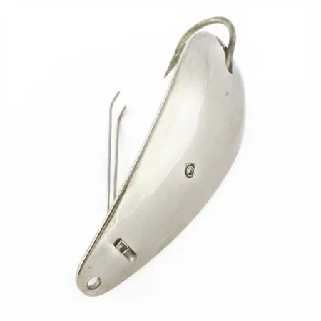 Le placage en argent définit le profil effilé de cette Master Weedless Lotta Junior de 5,5 cm. Fabriquée aux États-Unis, sa conception repose sur un corps en métal épais doté d'un hameçon simple intégré, conçu pour prospecter les zones à forte végétation. Pour éviter les accrochages, un dispositif anti-herbe composé de deux fils d'acier flexibles est monté à la base de l'hameçon, remontant vers la pointe. Cet exemplaire spécifique, portant le code produit 24158, présente une surface brillante et bien conservée, ce qui correspond à son état 5/5. À l'avant, un œillet d'attache percé avec précision permet un montage direct ou l'ajout d'un émerillon. Son poids de 12 g lui confère une masse substantielle pour les lancers à longue distance. Un petit rivet et des marquages estampillés sur le corps illustrent les techniques de fabrication du milieu du siècle dernier utilisées par la marque Master.
