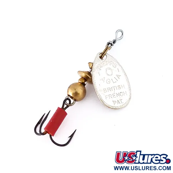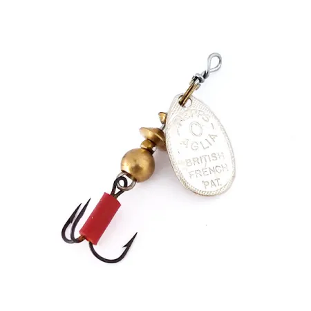 Le marquage sur la palette argentée révèle les inscriptions originales « British French Pat. » et « Aglia », un lien direct avec l'invention d'André Meulnart en 1938. Ce spécimen de taille 0 pèse 2,5 g (3/32 oz) et mesure 4,5 cm (1 3/4"), ce qui en fait un choix incontournable pour le lancer ultra-léger. Au verso, la palette est clairement marquée « Made in France », tandis que l'ensemble du leurre a été assemblé aux États-Unis. Le corps central présente un empilement de billes en laiton et une base lestée qui assure la stabilité du système de rotation monté sur étrier. Un détail notable est l'hameçon triple, équipé d'une gaine en plastique rouge distinctive conçue pour servir de point de mire visuel pour les truites ou les perches. En état 5/5, la finition argentée est exceptionnellement brillante et l'armature en laiton reste propre, indiquant qu'il a été soigneusement conservé. La tige métallique est serrée au niveau de l'œillet, démontrant la robustesse attendue pour le code 10339. La palette à profil large est conçue pour tourner instantanément dès la récupération, créant la résistance mécanique nécessaire pour que la cuiller fonctionne à différentes profondeurs.