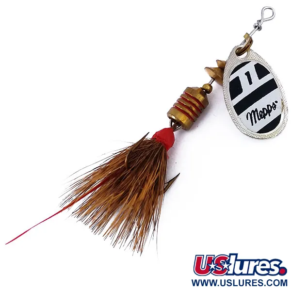 Les motifs rayés noir et blanc sur la palette de taille 1 offrent un profil visuel à haut contraste, souvent recherché pour les conditions de faible luminosité. Pesant 1/8 oz (3,5 g), ce Mepps Aglia 1 Dressed, identifié par la référence 10433, mesure 5 cm (2") de long et illustre l'assemblage minutieux typique de la période de transition de Mepps, où les composants fabriqués en France étaient finalisés aux USA. Le revers de la palette est clairement estampillé « MADE IN FRANCE », signifiant l'origine du design fondateur d'André Meulnart. Un corps en laiton massif avec des rainures profondes est positionné entre deux perles coniques, permettant à la palette de tourner librement sur l'axe en acier inoxydable. L'hameçon triple est expertement habillé de poils bruns naturels, accentué par une unique fibre rouge et un enroulement de fil rouge vif sur la hampe. Dans son état actuel, le leurre est dans une excellente condition 5/5, la peinture sur la face de la palette restant nette et les composants en laiton ne montrant aucun signe d'oxydation importante. Cette configuration spécifique, avec son habillage en poils d'écureuil, a été conçue pour donner du volume à la présentation tout en conservant le profil emblématique du spinner le plus reconnu au monde.