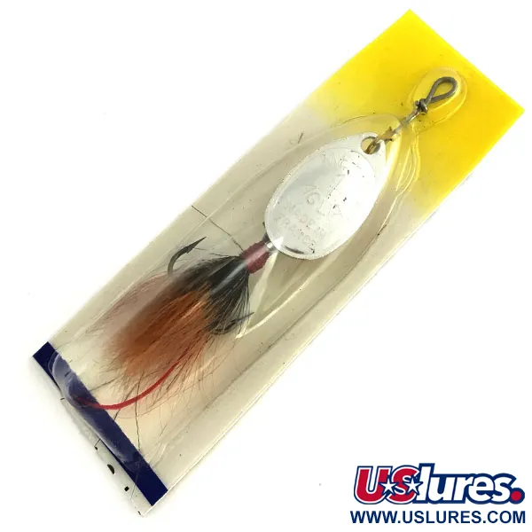 Une palette argentée caractérise cette cuiller tournante de 3,5 g (1/8 oz), un classique de la gamme Mepps. Identifié par le code produit 8678, ce modèle Aglia 1 dressed mesure 6 cm (2 1/4") de longueur totale. Le leurre est neuf, scellé dans son emballage d'origine, présentant la carte au dégradé jaune et blanc de l'époque du Mepps Fishing Guide d'Antigo, Wisconsin. Son habillage est composé de fibres brun foncé et noires avec un point rouge distinct à la base de l'hameçon triple. La palette arbore l'estampage traditionnel, rappel du design français d'Andre Meulnart de 1938 importé ensuite aux États-Unis. Cet assemblage de pièces américaines et étrangères respecte les standards de qualité de la marque. La coque transparente est intacte, protégeant la finition argentée réfléchissante et l'intégrité du pompon en plumes monté à la main.