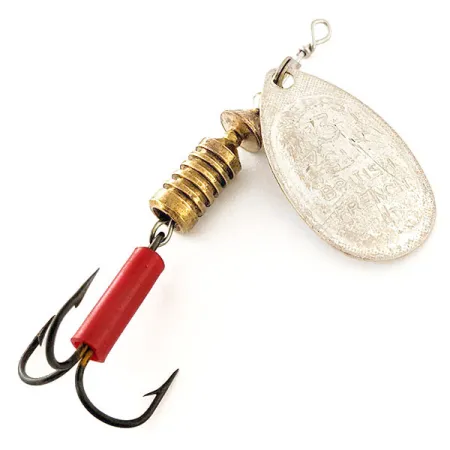 Une gaine rouge vif recouvre la hampe de l'hameçon triple, offrant un point de mire haute visibilité pour les carnassiers. Pesant 7g (1/4oz) pour une longueur de 7cm (2 3/4"), cette Mepps Aglia 3 est un exemple classique du design de cuiller tournante produit pour la société canadienne Breck's au cours des années 1970. La palette à la finition argentée présente des estampillages nets incluant le nom du fabricant et les références de brevet français, avec seulement de très légères traces de manipulation conformes à un état 5/5. Un corps lourd en laiton nervuré fournit le poids nécessaire au lancer, situé derrière un étrier qui permet à la palette de tourner autour de l'axe en corde à piano. Cet assemblage mécanique reflète la conception originale de 1938 par André Meulnart, axée sur une rotation immédiate dès la récupération. Le leurre est complété par un hameçon triple en métal foncé et un œillet traditionnel ligaturé à la tête pour une attache sécurisée du fil.