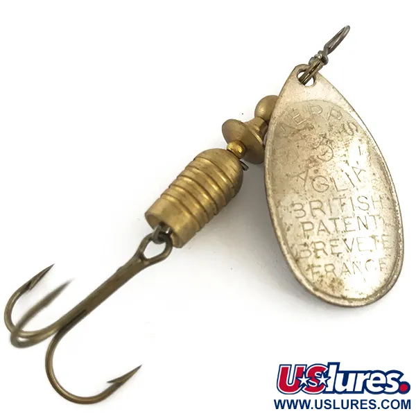 Les marquages « British Patent » et « Brevete France » gravés sur la palette argentée signalent immédiatement l'héritage du milieu du siècle de cette cuiller tournante de taille 3. Avec un poids de 7 g (1/4 oz) et une longueur de 7 cm (2 3/4"), ce spécimen est substantiel et bien équilibré. Identifié par le code produit 4415, sa construction comprend des segments de corps et des perles en laiton de haute qualité situés au-dessus d'un triple robuste. Ces composants spécifiques ont été fabriqués en France et assemblés aux USA, un signe distinctif de l'expansion de la marque au milieu du siècle. La palette à finition argentée est conçue avec un profil large pour faciliter une rotation rapide et générer des vibrations spécifiques lors de la récupération. Au verso, l'inscription « Made in France » reste nette et lisible. L'état général est exceptionnel, montrant une finition brillante sur toutes les surfaces métalliques, ce qui en fait un exemple 5/5 pour toute collection. Cette Aglia utilise un système de rotation précis sur cône sur l'axe central, un standard technique pour ce modèle depuis son invention par André Meulnart en 1938.