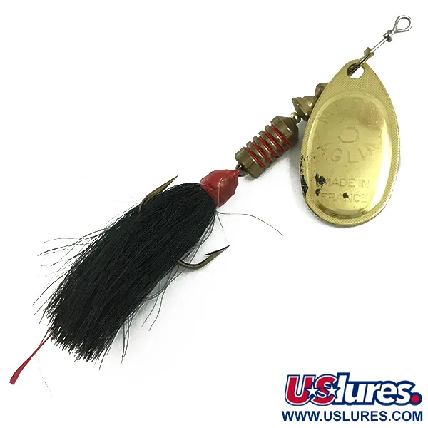 Gravée distinctement sur sa palette dorée avec les marquages emblématiques « AGLIA » et « MADE IN FRANCE », cette cuiller de taille 3 est un véritable classique pour tout pêcheur chevronné. Mesurant 6 cm pour un poids de 7,3 g, ce modèle présente la finition laiton traditionnelle, réputée pour sa visibilité quelles que soient les conditions de l'eau. Le corps est composé de plusieurs segments en laiton séparés par des rainures rouge vif, menant à un hameçon triple habillé de poils noirs d'écureuil ou de cerf. Référencée sous le code produit 5827, ce leurre témoigne de son histoire avec un état de conservation de 4/5, conservant l'éclat du métal et un garnissage complet du pompon. Assemblé aux États-Unis avec des composants français, il utilise un système de rotation à cône conçu pour que la palette tourne dès le début de la récupération. Un petit accent rouge à la base de l'habillage offre un point d'attaque précis pour les poissons suiveurs.