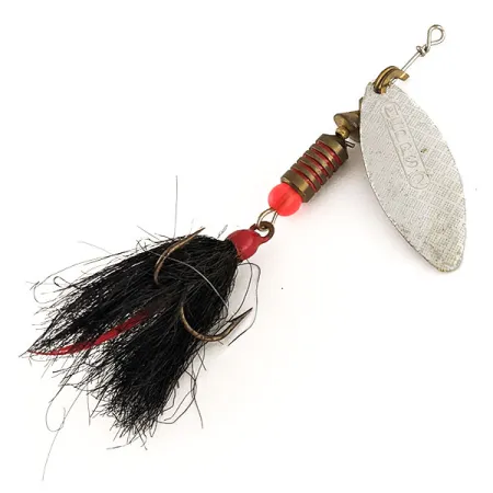 Les palettes en feuille de saule à finition argentée portant l'estampille « Made in France » identifient ce Mepps Aglia Long 2 Dressed comme un exemple classique de la série 12416. Pesant 7,3 g (1/4 oz), le leurre est construit autour d'un corps en laiton segmenté avec des accents rouges en creux et une perle rouge pour le contraste visuel. L'hameçon triple à plumes est garni de poils noirs épais avec un éclat de rouge, ajoutant du volume au profil de 7 cm (2 3/4"). Son armature en fil d'acier inoxydable est finie par un enroulement précis à l'œillet, fixant l'étrier en laiton qui maintient la palette. Ce modèle, combinant des composants fabriqués en France et un assemblage aux États-Unis, conserve un état de 5/5, toutes les inscriptions sur la palette argentée restant nettes et la garniture de l'hameçon étant parfaitement intacte. Les remplissages de peinture rouge sur le corps lesté sont vibrants et appliqués proprement.