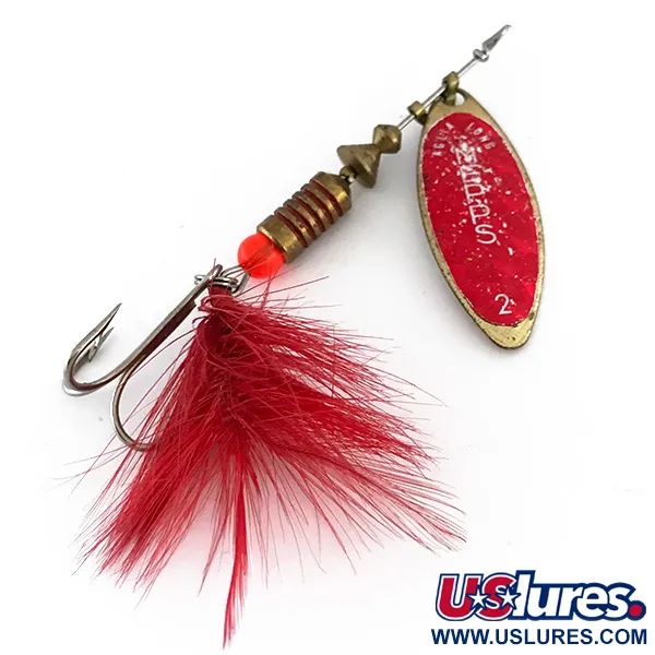 Un bouquet de plumes rouges décore l'hameçon triple de ce spécimen, le marquant comme une variante classique à pompon d'un design de cuiller légendaire. La palette en forme de feuille de saule, caractéristique de la série Long, présente une face rouge profond frappée du numéro 2, tandis que le revers doré arbore fièrement le poinçon "Made in France". Pesant 7,3 g (1/4 oz) et mesurant 7 cm (2 3/4"), l'architecture du leurre est construite autour d'une tige en acier robuste. Cette tige supporte une série de segments de corps en laiton, notamment un poids cannelé distinctif et des cylindres striés, suivis d'une perle orange haute visibilité. Ces composants métalliques et la surface peinte de la palette sont exceptionnellement bien conservés, méritant une note de 5/5. Répertoriée sous le code produit 8258, cette cuiller tournante a été assemblée aux États-Unis à partir de ces composants français de haute qualité. La combinaison du laiton aux reflets dorés et des accents rouges offre un profil contrasté qui met en valeur le savoir-faire des pièces d'origine.