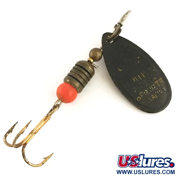 Un poids de 4,3 g (1/8 oz) fait de cette Mepps Comet 2 spécifique, code produit 4724, un choix classique pour les configurations de spinning ultra-léger et léger. La palette ovale noire est clairement estampillée des marquages français traditionnels, notamment « Mepps Comet » et « Brevete France », soulignant l'origine de ses composants avant l'assemblage aux États-Unis. Sa structure centrale se compose d'un corps en laiton segmenté et d'une perle orange vif placée près de la base pour servir d'indicateur de touche. Mesurant 6 cm (2 1/4") de la pointe à l'hameçon, la cuiller conserve son armature d'origine. L'hameçon triple et la tige métallique présentent une légère usure liée à l'âge, bien que le leurre reste dans un état solide de 4/5. La finition noire de la palette reste bien conservée, illustrant les standards de fabrication qui font la renommée de Mepps.