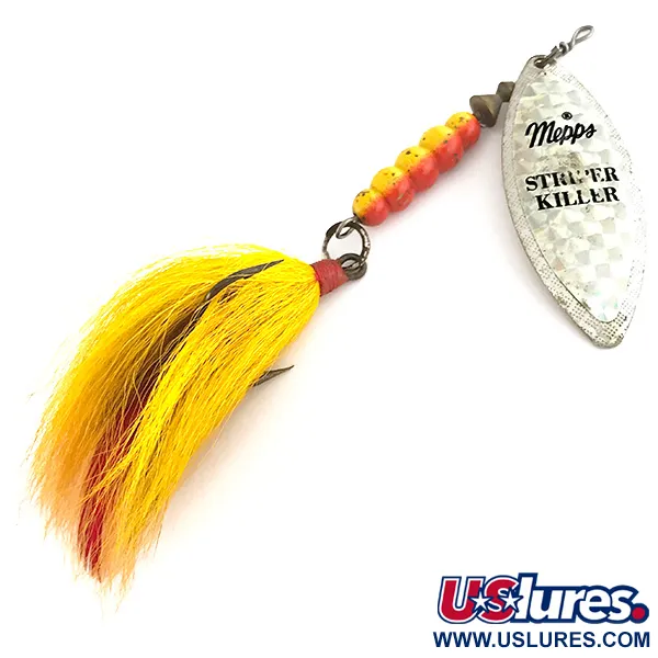 Affichant un poids substantiel de 30 g (1 oz), cette cuiller tournante de fabrication française est dotée d'une large palette argentée estampillée des mentions « Mepps Striper Killer » et « Giant Killer ». Une série de perles jaune vif et rouges forme le corps segmenté, menant à un triple richement habillé de plumes jaunes avec une touche de rouge à la base. Ce spécimen particulier, identifié par le code produit 7434, mesure 12 cm (4 3/4") de longueur totale et est conservé dans un excellent état 5/5. Le revers de la palette affiche clairement le poinçon « Made in France » et le marquage « Giant Killer », reflétant l'héritage de l'un des fabricants de matériel de pêche les plus reconnus au monde. Conçue pour cibler les grands carnassiers en eau profonde, sa construction lourde et sa queue plumeuse offrent un profil imposant sans sacrifier la distance de lancer. L'intégrité de l'armature métallique et la propreté de la finition argentée en font un exemple de haute qualité de la production vintage Mepps.