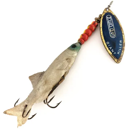 Un poids substantiel de 40 g (1 1/3 oz) leste cette cuiller tournante robuste, qui mesure 17 cm (6 3/4") de longueur totale. La palette 'Giant Killer' se distingue par sa face bleue à lettrage blanc, tandis que l'envers affiche la finition laiton naturel. L'empilement de perles rouges et jaunes sur l'axe crée un contraste vif avant de rejoindre le corps souple du vairon. Identifié par le code produit 12474, ce leurre représente une période où les composants fabriqués en France étaient assemblés aux États-Unis pour le marché nord-américain. Le corps aux écailles argentées est accentué par un œil de couleur sarcelle et abrite des hameçons à finition sombre. Classé dans un état 4/5, le spécimen présente de légères traces de stockage et une usure normale sur les surfaces métalliques. Les hameçons triples à finition sombre sont positionnés le long du ventre et de la queue du corps souple.