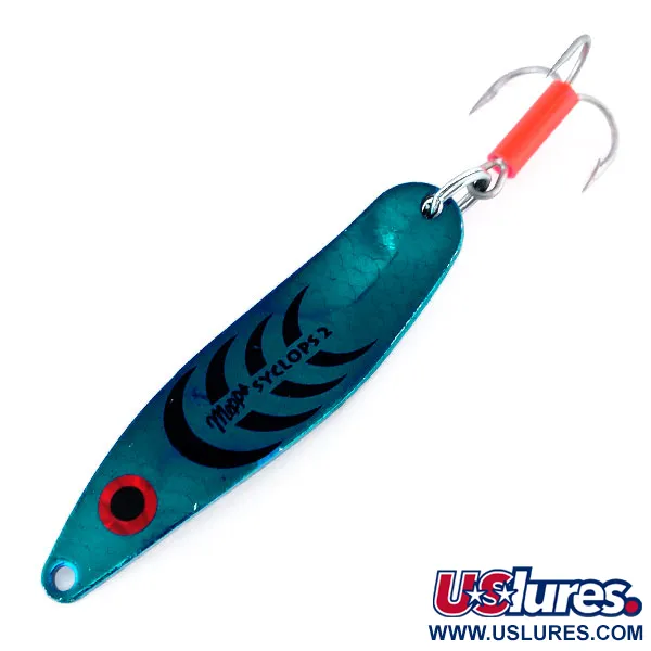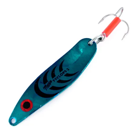 Mesurant 7,5 cm (3 pouces), ce leurre arbore le profil classique en S caractéristique de la série Syclops. Une finition bleu métallisé recouvre la face convexe, décorée d'écaillures noires en croissant et d'un œil rouge vif. La face concave révèle l'argent poli estampillé du logo Mepps Syclops 2, du poids de 17 g (3/5 oz) et du marquage « Made in France ». Référencé sous le code 10008, ce modèle affiche un état de 5/5, sans aucune trace d'utilisation. Un hameçon triple standard est fixé via un anneau brisé, agrémenté d'une gaine attractive rouge. Toutes les surfaces métalliques restent brillantes et réfléchissantes.