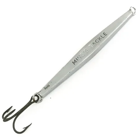 Estampillé « MIKE'S TACKLE » et « SLIM JIM » sur ses faces plates opposées, ce jig métallique présente un profil effilé classique conçu pour la présentation verticale. Pesant 44 g (1 1/2 oz) pour une longueur de 10 cm (4"), il possède une masse suffisante pour atteindre rapidement les profondeurs. La finition Nickel offre une surface très brillante, un choix traditionnel pour imiter les poissons fourrage dans diverses conditions de luminosité. Noté 4/5, cet exemplaire conserve une qualité réfléchissante éclatante sur tout son corps allongé, avec seulement quelques signes mineurs de son histoire. Il présente une conception simple mais efficace avec un hameçon triple robuste fixé via un anneau brisé, associé à un œillet d'attache solide à la tête. Ce leurre Mike's Tackle, identifié par le code produit 6849, est un exemple typique de la fabrication américaine de leurres métalliques du milieu du siècle.