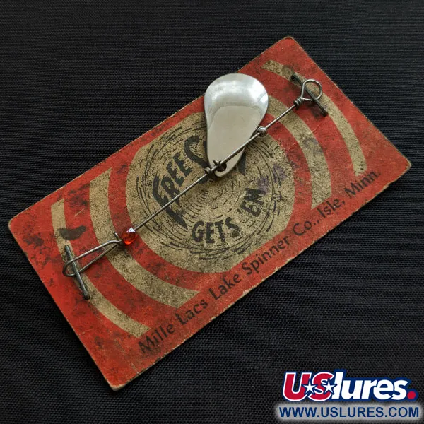 Le placage en nickel de la palette en forme de goutte d'eau définit le profil visuel de cette cuiller tournante Mille Lacs Lake. Fixé sur sa carte de présentation d'origine rouge et or de style « cible », cet article n'a jamais été utilisé et demeure dans l'état exact où il a quitté l'usine Mille Lacs Lake Spinner Co. à Isle, dans le Minnesota. Une perle rouge unique à facettes est enfilée sur l'axe en fil métallique, qui mesure 6 cm de long. Cet exemplaire spécifique, identifié par le code produit 20622, affiche un poids plume de 1 g. Sa fabrication se caractérise par un étrier simple pour la palette et des œillets en fil métallique torsadés à la main aux deux extrémités, illustrant une approche classique du matériel de pêche en lac fabriqué aux États-Unis.