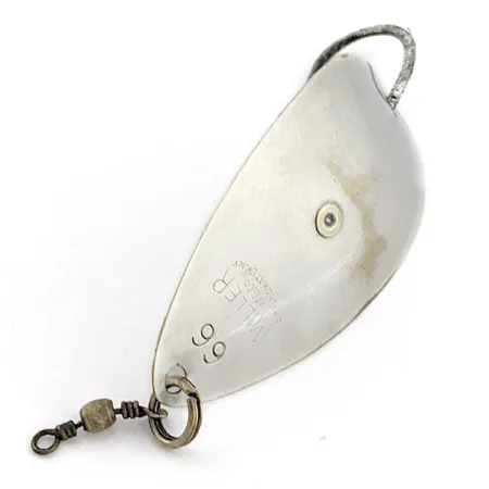 Au revers, le métal est frappé de l'identifiant « Miller 66 » et de son origine américaine. Le placage en argent accroche la lumière sur les 5,5 cm (2 1/4") de cette cuillère de fabrication américaine, affichant un poids polyvalent de 7 g (1/4 oz). Considéré comme une rareté dans l'univers du matériel de pêche vintage, ce modèle possède un grand hameçon simple fixé directement à travers le corps. Son état de conservation est de 4/5, présentant seulement de légères marques de surface dues au temps tout en gardant un fini brillant et réfléchissant. L'armement se compose d'un anneau brisé robuste en tête relié à un émerillon baril d'origine, prévu pour le lancer ou la traîne. Référencé sous le code produit 22949, ce leurre se distingue par son assemblage à rivet central, emblématique de la robustesse des conceptions Miller. Le métal de l'hameçon a légèrement bruni avec les années, créant un contraste visuel marqué avec le corps poli.