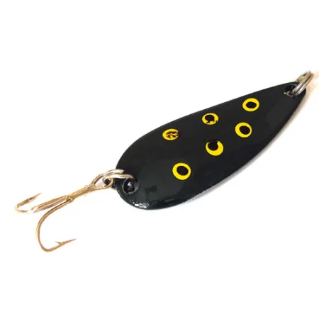 Avec son poids de 11 g (2/5 oz), cette cuillère Moriyama possède la densité nécessaire pour atteindre des cibles profondes lors du lancer. Originaire du Japon, ce leurre arbore un motif contrasté nommé Frog, composé d'un dos noir uni orné de cinq cercles jaunes distincts. Mesurant 5 cm (2"), son corps métallique en forme de goutte présente un dos en nickel poli pour un éclat métallique optimal. Ce modèle spécifique, portant le code 0902, est conservé dans un état 4/5, ne montrant qu'une légère usure de surface conforme à son statut vintage. Il est équipé d'un hameçon triple bronzé fixé par un anneau brisé, avec un anneau supplémentaire en tête pour une attache sécurisée du fil.