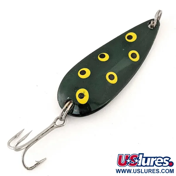 Une peinture vert forêt profond sert de base à six yeux jaunes et noirs peints à la main sur la face convexe de cette cuillère ondulante de fabrication japonaise. Pesant 11 g (2/5 oz), ce leurre est conçu pour le lancer en pleine eau ou le long des herbiers. Le revers présente une finition en nickel poli qui capte la lumière, portant le nom « Moriyama » et l'origine « JAPAN » estampillés. D'une longueur de 5 cm (2"), son profil en forme de larme est associé à un hameçon triple robuste et des anneaux brisés d'origine. Référencée sous le code 13117, cette cuillère ne présente aucun signe d'usure significatif et reste dans un état excellent avec une note de 5/5. La palette de couleurs contrastées du motif grenouille est protégée par un vernis brillant épais. Le marquage « Moriyama » est frappé avec précision dans le métal sur la courbure intérieure.