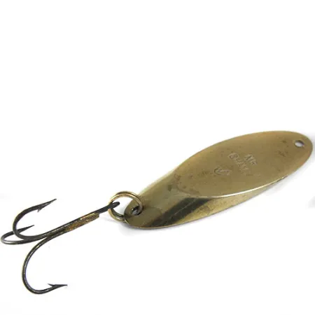Pesant un poids substantiel de 35 g (1 1/4 oz), cette cuillère ondulante vintage illustre la fabrication en laiton massif qui a défini les débuts de la société Weber aux USA. Mesurant 6,5 cm (2 1/2") de long, le leurre présente un profil en goutte d'eau clairement estampillé du nom Mr Champ et du logo distinctif de la marque. Ce spécimen spécifique, identifié par le code produit 0648, affiche un état de 3/5, présentant une surface patinée que les collectionneurs apprécient souvent comme un signe d'authenticité et d'ancienneté. L'armement est ancré par un anneau brisé renforcé à l'arrière, fixant un large hameçon triple conçu pour cibler les gros poissons de sport. Weber, un fabricant américain avec plus d'un siècle d'histoire, a finalement vu ce design couronné de succès passer au catalogue Luhr Jensen. Le métal de forte épaisseur et l'œillet simple au nez effilé soulignent sa conception utilitaire, destinée principalement aux lancers à longue distance ou aux techniques de jigging en eau profonde.