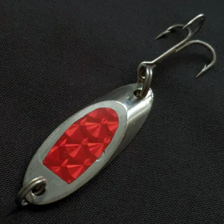Pesant exactement 7 g (1/4 oz), cette pièce classique de l'histoire du matériel de pêche américain témoigne du savoir-faire de Weber. Mesurant 4 cm (1 1/2"), le Mr Champ arbore un corps en argent poli orné en son centre d'un insert holographique rouge vif. Cet autocollant prismatique présente une texture détaillée en motif de diamant pour maximiser la réflexion de la lumière sous différents angles. L'armature se compose d'anneaux brisés doubles et robustes aux deux extrémités, supportant solidement un hameçon triple argenté. Référencée sous le code produit 22145, cette cuillère fabriquée aux États-Unis est en état 5/5, affichant une finition brillante et bien entretenue sur ses surfaces métalliques. Le revers du leurre reste en argent poli uni, contrastant nettement avec la face avant décorée.