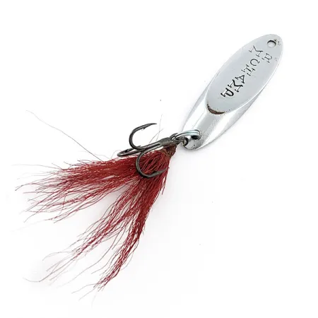 Polie avec une finition nickel brillant, le corps métallique de cette cuillère mesure 1 1/2" (4 cm) et arbore le marquage « MR CHAMP » frappé en profondeur sur sa surface. Ce modèle 22810 provient du fabricant américain Weber, une marque possédant un héritage centenaire sur les marchés américain et canadien avant l'acquisition du leurre par Luhr Jensen. D'un poids de 7 g (1/4 oz), sa conception se caractérise par un hameçon triple habillé d'un bucktail rouge distinctif, fixé par un anneau brisé robuste pour offrir un point d'attraction visuel contrastant avec l'éclat argenté. L'armement reste en excellent état et le placage réfléchissant est bien conservé, ce qui justifie une note d'état de 4/5. Un œillet d'attache unique est percé avec précision à l'extrémité étroite du corps en forme de goutte d'eau.