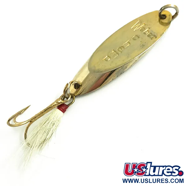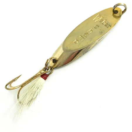 Estampillé sur le corps métallique poli de 14g (1/2oz), le nom Weber identifie ce MrChamp comme un héritage du matériel de pêche américain d'une entreprise centenaire aux USA et au Canada. Ce modèle doré de 5cm (2"), identifié par le code produit 6068, représente le design avant l'intégration de la marque dans la gamme Luhr Jensen. Son état est remarquablement propre, avec une note de 5/5 pour l'éclat préservé de sa finition. L'extrémité arrière est équipée d'un hameçon triple plumé, doté de poils blancs fixés par une ligature en fil rouge traditionnelle. Un anneau brisé robuste à l'avant assure une connexion solide pour le lancer ou le jigging.