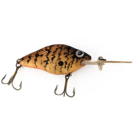 Un mouchetage riche et sombre sur une base ambre définit la finition de ce spécimen, un modèle né de l'héritage de réalisme de la Kautzky Manufacturing Company. Mesurant 6 cm, le leurre présente un motif texturé de manière complexe conçu pour imiter une proie naturelle, une marque de fabrique de l'enseigne après son passage des corps en bois au plastique durable dans les années 1960. La bavette de plongée transparente et surdimensionnée est marquée du logo « Natural Ike », un détail essentiel pour identifier le code produit 14284. Pesant 10 g, le corps est équipé de deux hameçons triples bronzés qui restent affûtés et parfaitement fixés sur leurs attaches de ventre et de queue. Ce leurre affiche un état de 5/5, présentant une surface propre et une bavette parfaitement transparente sans voile. Son profil reflète l'élan américain du milieu du siècle vers des leurres conservant la qualité esthétique des designs originaux sculptés à la main par Joseph Kautzky. L'attache est fixée directement à travers la bavette en plastique, un détail de construction destiné aux présentations en grande profondeur.