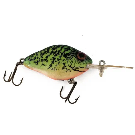 D'une longueur de 5 cm (2"), cet exemplaire illustre l'évolution de la marque Lazy Ike au milieu du siècle, passant d'une fabrication artisanale en bois à un plastique durable. La finition de ce crankbait de 8 g (1/4 oz) présente un motif détaillé de type « crappie », utilisant une base vert vif recouverte de marbrures noires denses et un ventre crème pâle. Son grand œil sombre est un élément de conception caractéristique de la série Natural Ike, destiné à imiter les traits anatomiques d'un véritable panfish. Initialement produit par la Kautzky Manufacturing Company, entreprise fondée en 1897 par un immigrant autrichien et intégrée par la suite au groupe Pradco, ce modèle porte le code produit 14779. La bavette plongeante en plastique transparent est gravée au nom du modèle ; bien qu'elle présente une petite fissure, ce leurre reste une pièce significative de l'histoire du matériel de pêche américain. Deux hameçons triples standards sont fixés via des anneaux de fixation sous le ventre et à la queue. Cet exemplaire est évalué en état 4/5, affichant une peinture bien préservée malgré une légère fatigue du matériau au niveau de la bavette.