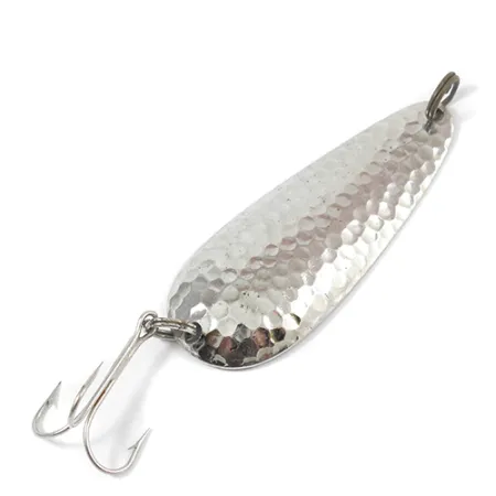 Une finition martelée distinctive sur la surface convexe définit le caractère visuel de cette cuillère ondulante classique. Mesurant 3" (7,5 cm) pour un poids de 1/2oz (14 g), ce modèle en Nickel martelé présente un extérieur multi-facettes conçu pour capter la lumière sous différents angles. Sur l'intérieur lisse, le métal est frappé de la marque du fabricant l'identifiant comme une Nebco Flashbait 166, fabriquée aux USA. Cette pièce particulière, identifiée par le code produit 1975, est en excellent état avec une note de 5/5, conservant une surface brillante et propre des deux côtés. L'armement comprend des anneaux brisés d'origine et un hameçon triple robuste ne montrant aucun signe de vieillissement. Les cuillères lourdes comme cette Nebco étaient un équipement standard pour les pêcheurs ayant besoin de poids supplémentaire pour atteindre des profondeurs spécifiques ou lancer face à des vents côtiers puissants.