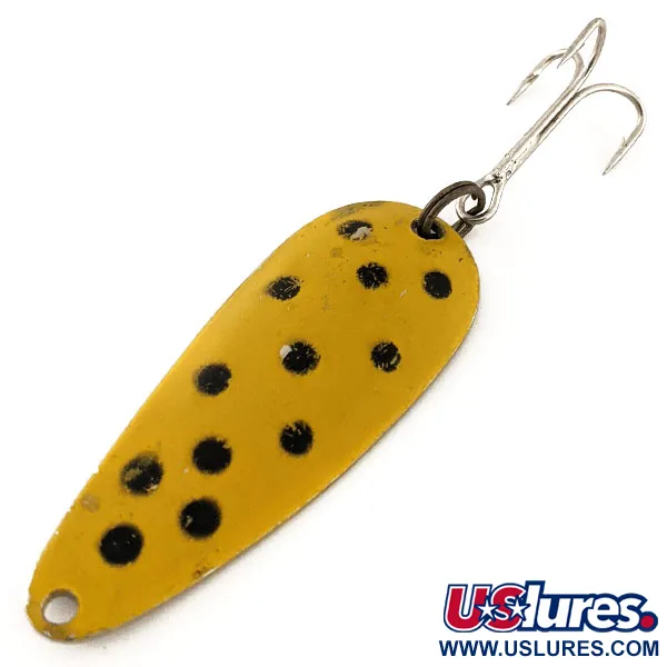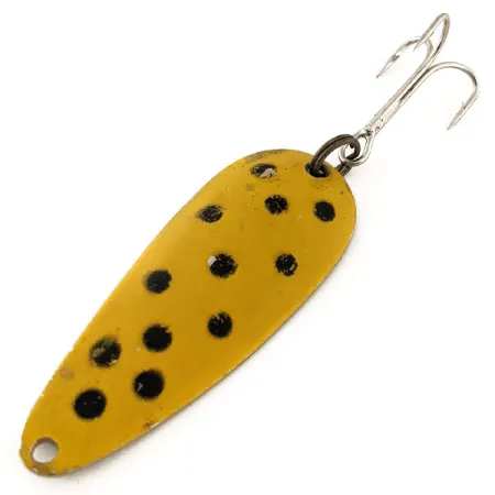 Une peinture jaune agrémentée de grands points noirs frappés à la main recouvre la face convexe de cette cuillère ondulante en métal de 5,5 cm. Pesant 10 g, la Nebco FlashBait 266 révèle un revers en nickel poli où le marquage "FLASH BAIT NEBCO" et l'origine USA sont frappés dans le métal. L'armement se compose d'un anneau brisé noirci et d'un hameçon triple piquant. Répertorié sous le code 11765, ce modèle vintage bénéficie d'une note de condition 4/5, présentant une légère usure de stockage tandis que la peinture et le marquage restent bien nets.