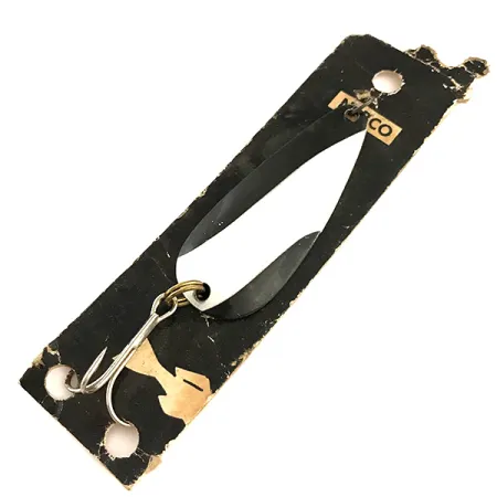 Pesant 10 g (1/3 oz), le corps en nickel poli de cette cuillère fabriquée aux États-Unis demeure dans son état d'origine, jamais utilisé. Mesurant 5,5 cm (2 1/4") de long, la Nebco FlashBait 266 (code produit 6421) est un objet de collection parfaitement conservé, toujours fixé sur sa carte de vente d'origine en noir et blanc. La finition en nickel offre une surface réfléchissante à haut contraste, typique des cuillères ondulantes de cette époque destinées au lancer. Un hameçon triple acéré est fixé via un anneau brisé laitonné, respectant la configuration matérielle d'origine. Ce spécimen est classé 6, ce qui signifie qu'il n'a jamais été utilisé et a été conservé comme objet de collection depuis sa fabrication. Le graphisme de l'emballage reste parfaitement lisible et le métal ne présente aucun signe d'usure ou d'oxydation.