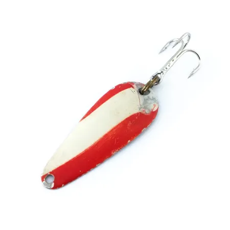 Des rayures diagonales rouges et blanches sur un corps en forme de larme nickelé définissent le caractère visuel de ce Nebco FlashBait 366 vintage. Pesant à peine 1,9 g (1/16 oz) pour une longueur de 3,3 cm (1 1/4"), il illustre la finesse du matériel de pêche américain du milieu du siècle. En retournant la cuillère, on découvre le poinçon authentique du fabricant Nebco pressé dans le métal, confirmant son origine américaine. Cet article, répertorié sous le code 11092, bénéficie d'une note d'état de 4/5, affichant une finition bien entretenue qui conserve tout son éclat. L'armement se compose d'un anneau brisé classique et d'un hameçon triple piquant, respectant le profil d'origine du leurre. L'application de la peinture présente la texture stratifiée distincte typique de l'époque, contrastant avec le dos en nickel poli.