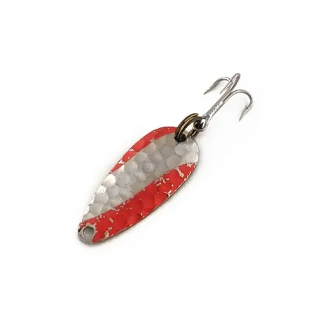 La texture en nickel martelé sur la face de la palette définit ce Nebco FlashBait 466, une pièce minuscule de l'histoire du matériel de pêche américain pesant à peine 1/32 oz (1 g). Mesurant seulement 3/4" (2,2 cm) de long, le leurre présente un motif de couleur distinct composé de larges rayures diagonales rouges sur la surface alvéolée. Ce modèle spécifique, identifié par le code produit 11762, met en avant le design classique de Nebco destiné au lancer ultraléger de précision. Le revers en métal lisse est clairement estampillé du nom de la marque et de la mention « MADE IN USA », reflétant l'héritage manufacturier de l'époque. L'armement se compose d'un anneau brisé aux tons sombres associé à un hameçon triple piquant. Classé 5/5, ce spécimen présente une peinture bien conservée et un marquage net, constituant un bel exemple de l'artisanat des micro-cuillères du milieu du siècle.