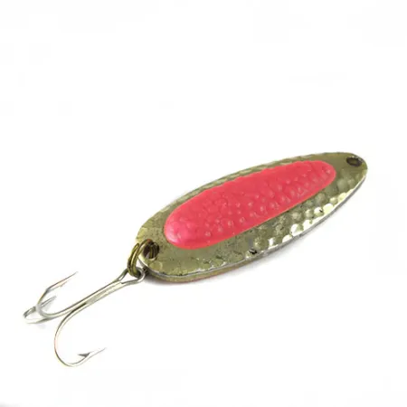 Pesant 1/2 oz (14 g), cette cuillère ondulante au corps en laiton présente les éléments de conception classiques qui ont fait de la National Expert Bait Company — mieux connue sous le nom de Nebco — une référence pour les pêcheurs du Nord. Mesurant 2 1/4" (5,5 cm) de long, ce spécimen arbore une finition martelée distinctive sur la face, entourant un insert rose texturé destiné à simuler une grappe d'œufs de saumon. En retournant le leurre, vous trouverez l'estampille « Nebco PIXEE PAT. PEND. » clairement visible sur le dos lisse, aux côtés du code produit 0525. L'armement comprend un hameçon triple robuste fixé par un anneau brisé solide, témoignant d'une qualité de fabrication prévue pour les lancers lourds dans les courants de rivières ou les vents côtiers. Avec une évaluation de l'état de 5/5, les surfaces en laiton restent brillantes et l'emblématique insert rose est solidement fixé sans dégradation. Conçue spécifiquement pour atteindre les fosses profondes où se tiennent les saumons trophées et les truites steelhead, la construction en laiton de forte épaisseur offre la densité nécessaire pour les lancers à longue distance. Bien que de nombreuses versions modernes existent sous la marque Blue Fox, ces premières pièces estampillées Nebco sont les véritables originaux des années 1960. L'insert rose offre un contraste visuel net avec le laiton doré, une combinaison de couleurs longtemps privilégiée pour les conditions de faible luminosité ou les eaux teintées.