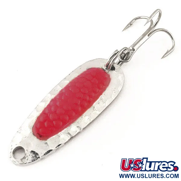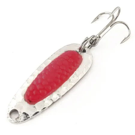 Un insert d'œuf de saumon simulé rouge vif occupe le devant de la scène sur cette cuillère ondulante de 3,5 cm (1 1/2"), offrant un stimulus visuel sur la finition en nickel martelé. Identifiée par le code produit 12188, cette Nebco Pixee pèse 4,5 g (3/16 oz) et possède un corps en laiton de forte épaisseur conçu pour la stabilité dans les courants forts ou les lancers à longue distance. Originaire de la National Expert Bait Company — le prédécesseur de l'actuelle marque Blue Fox — ce leurre est un choix classique pour le saumon et la truite steelhead. La texture martelée capte la lumière sous tous les angles, tandis que l'insert rouge présente un éclat distinct sous faible luminosité, imitant l'apparence de vrais œufs de poisson. L'armement comprend un triple robuste relié par un anneau brisé solide. Présenté dans un état 5/5, l'exemplaire affiche une finition brillante et ne présente aucune usure.