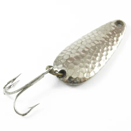Dotée d'une finition en nickel martelé aux alvéoles profondes, cette cuiller de 4 cm (1 1/2") est conçue pour maximiser la surface de réflexion de la lumière. Le revers reste lisse et porte l'estampille distinctive 'NEBCO TOR-P-DO 1 MPLS. MINN.', témoignant de son héritage de Minneapolis. Ce spécimen particulier, portant le code produit 3277, pèse 7 g (1/4 oz), ce qui en fait un excellent choix pour cibler les truites ou les perches au lancer. L'armement se compose d'un hameçon triple classique fixé par un anneau brisé aux surfaces bien entretenues. Évalué à 4/5, le placage en nickel conserve un éclat de haute qualité sur les deux faces avec seulement de légères traces du temps. L'œillet de fixation est percé proprement à l'extrémité effilée, prêt pour un nœud direct ou une petite agrafe.