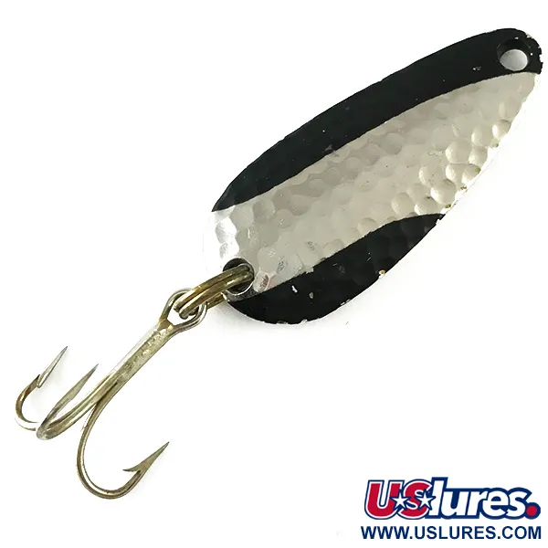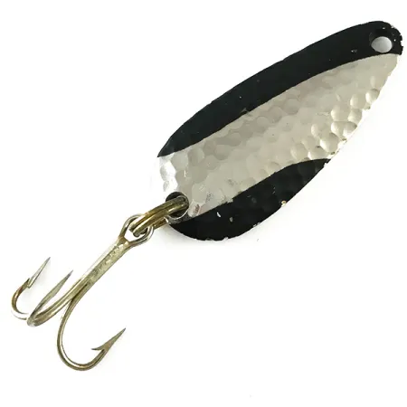 Des textures en nickel martelé associées à des accents noirs prononcés définissent le profil visuel frappant de cette cuillère vintage. Mesurant 1 1/2" (4 cm) et pesant 1/4 oz (7 g), ce modèle porte l'estampille distincte « NEBCO » TOR-P-DO-1 ainsi que ses origines à Ripley, Miss. sur le revers poli. La face avant présente une finition martelée conçue pour capter et renvoyer la lumière, encadrée par une peinture noire profonde sur les pointes. Identifiée par le code produit 6235, cette cuillère est équipée d'un hameçon triple classique fixé par un anneau brisé robuste. Sa fabrication en métal massif est typique de la production américaine du milieu du siècle en provenance des États-Unis. L'état est excellent, montrant une finition bien conservée et un estampillage net, méritant une note de 5/5. Le trou d'attache est propre et percé avec précision à l'extrémité étroite de la forme en goutte d'eau.