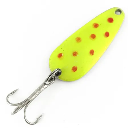 Une peinture jaune fluorescent recouvre l'avant de cette cuillère ondulante de 5 cm (2"), offrant une grande visibilité pour les eaux profondes ou teintées. Identifiée par le code produit 7109, la Nebco Tor-P-Do 2 UV présente une série de points rouges sur sa face, créant un motif à fort contraste qui ressort sur la base en nickel. Ce leurre fabriqué aux États-Unis est construit sur un corps nickelé poli, clairement frappé au verso du marquage "NEBCO TOR-P-DO 2". Pesant 14 g (1/2 oz), la cuillère est parfaitement adaptée aux lancers longue distance et à une descente contrôlée dans différentes couches d'eau. Son revêtement fluorescent est spécifiquement conçu pour être réactif aux UV, destiné à briller sous la lumière ultraviolette pour attirer l'attention dans les environnements sombres. Un anneau brisé robuste relie le corps métallique à un hameçon triple piquant à l'extrémité arrière. Avec une note d'état de 4/5, l'exemplaire reste en excellente forme avec seulement des traces mineures de manipulation visibles sur la finition.
