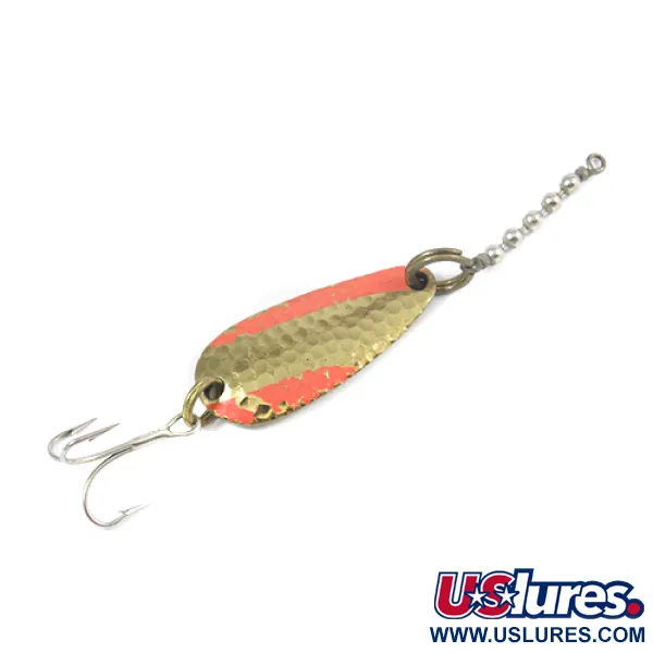 Des rayures rouges diagonales traversent la surface en or martelé de cette cuillère de 4 cm (1 1/2"), créant un contraste visuel distinct. Pesant 7 g (1/4 oz), ce modèle présente une texture profondément martelée sur l'avant pour maximiser la réflexion de la lumière. Le revers du leurre révèle une face arrière en or poli et lisse, clairement frappée de la marque du fabricant : "Nebco", "TOR-P-DO-1" et "MADE IN USA". L'armature reste intacte, composée d'un anneau brisé relié à un émerillon à chaînette, conçu pour gérer la torsion de la ligne lors des lancers ou de la traîne. Noté 4/5, le leurre montre de légers signes d'utilisation tout en conservant son intégrité structurelle et sa finition éclatante. Un hameçon triple piquant est attaché à la queue via un anneau brisé, complétant ce classique de fabrication américaine répertorié sous le code produit 2082.