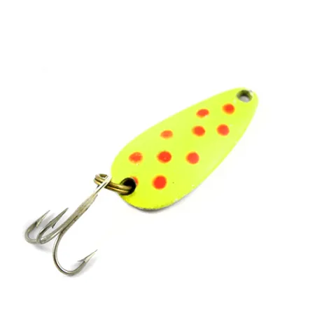 Pesant 9 g (1/3 oz), cette cuiller compacte présente une face avant jaune vif accentuée par des points orange-rouge distincts. Le revers révèle une finition en nickel poli profondément estampillée « NEBCO » et « TOR-P-DO », témoignant de son héritage de fabrication américaine. Mesurant 4 cm (1 1/2"), le corps métallique est équipé d'un anneau brisé en laiton robuste et d'un hameçon triple argenté. L'application de la peinture sur le devant est remarquablement nette, tandis que le dos en nickel conserve un lustre brillant, justifiant un état de 4/5 pour ce modèle 2751. Les pêcheurs utilisent généralement ce profil en forme de goutte d'eau pour diverses applications de lancer ou de traîne. Le lettrage estampé sur le côté concave reste net et lisible, un détail clé pour les collectionneurs de matériel Nebco vintage.
