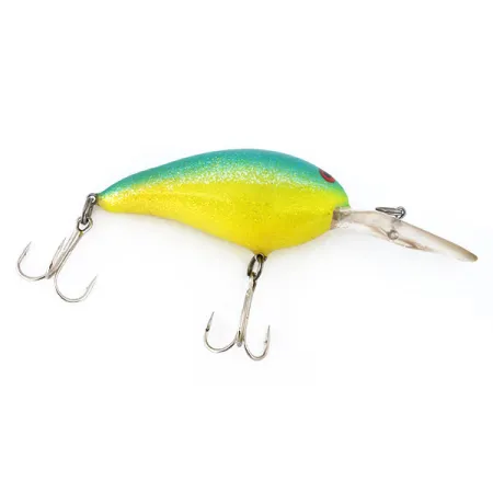 Un dos vert profond se fond dans un ventre jaune vif sur le corps pailleté de ce spécimen. Identifié par le code produit 10920, ce Norman DD 14 est un crankbait grand plongeur classique conçu pour atteindre des profondeurs de 3,6 m à 4,2 m (11,8 ft - 13,8 ft). Son poids substantiel de 16 g (3/5 oz) fournit la masse nécessaire pour de longs lancers lors de la prospection de structures profondes ou pour une traîne efficace le long des cassants. Mesurant 7 cm (2 3/4"), le leurre dispose d'une chambre de résonance interne conçue pour émettre des sons lors de la récupération. La grande bavette transparente est caractéristique de la série Deep-Diving de Norman, ancrée par une armature robuste qui reste en excellent état 5/5. Chaque détail, des yeux rouges proéminents aux hameçons triples bien conservés, reflète son artisanat d'origine fabriqué aux États-Unis.