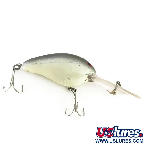 Pesant un poids substantiel de 28 g (1 oz), ce spécialiste de la grande profondeur est conçu pour atteindre 6,5 m (21,3 ft). Son corps de 8 cm (3 1/4") arbore un motif de couleur classique avec un dégradé gris-argent sur le dos et un ventre blanc cassé (bone). Une paire d'yeux rouges vifs se situe juste au-dessus de la bavette transparente surdimensionnée, qui permet à ce modèle de descendre rapidement et de rester dans la zone d'attaque. Ce spécimen particulier, portant le code produit 8169, est issu d'une lignée de leurres fabriqués aux États-Unis, réputés pour leur fiabilité en eaux libres. En tant que crankbait flottant et bruiteur, il offre une présence acoustique distincte par rapport aux versions silencieuses. L'armature reste nette et brillante, et l'état général du leurre mérite une note de 5/5. Chaque composant, des anneaux brisés aux hameçons triples tranchants, reflète l'assemblage d'usine original en provenance des USA.
