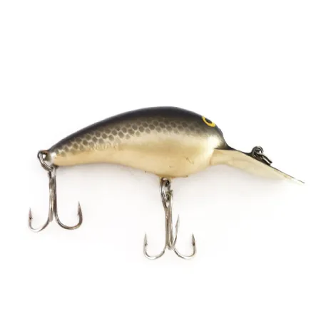Un motif d'écailles dorées orne les flancs de ce leurre, passant à un dos gris-noir foncé pour imiter un poisson fourrage de profondeur. Conçu pour atteindre des profondeurs comprises entre 1,8 et 2,4 m (6-8 ft), le Norman Deep Baby N possède une bavette noire proéminente portant le code produit 9988. Ce crankbait de 7g (1/4oz) mesure 5,5 cm (2 1/4") et intègre un système de billes bruiteuses adapté aussi bien au lancer qu'à la traîne. Les yeux peints en jaune offrent un contraste net avec la tête plus sombre, tandis que les deux hameçons triples restent brillants et intacts. Issu de l'héritage de la fabrication américaine de matériel de pêche, la finition de ce modèle est remarquablement bien conservée, méritant une note de 5/5. Un anneau brisé d'usine est fixé directement à l'attache de la bavette, prêt pour une utilisation immédiate ou pour être exposé dans une collection vintage.
