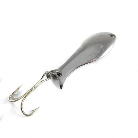 L'estampillage sur le côté concave identifie clairement son origine norvégienne, où Paravan produisait ces cuillères métalliques distinctives en forme de poisson. Mesurant 4 cm (1 1/2"), ce spécimen présente une finition en nickel poli qui conserve un éclat brillant sur ses surfaces bombées. L'armement se compose d'un hameçon triple robuste fixé par un anneau brisé à la queue, dont la forme évoque distinctement une nageoire caudale. Répertorié sous le code produit 1041, le leurre pèse 5,5 g (3/16 oz), ce qui convient aux techniques de lancer léger. Les collectionneurs apprécieront la note d'état 5/5, car le métal réfléchissant ne présente aucune usure notable. Le marquage de la marque et l'origine sont nets et lisibles sur l'intérieur lisse de la cuillère.