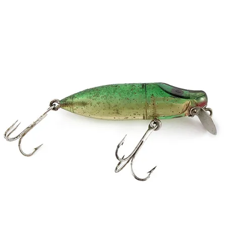 Des nuances de vert se fondent dans un ventre doré chaleureux sur ce spécimen de fabrication américaine de la Paw Paw Bait Company. Avec une longueur de 7,5 cm (3") et un poids de 12 g (2/5 oz), le Master Wiggler est considéré comme une rareté majeure pour les collectionneurs. Sa conception présente une bavette métallique distincte et une configuration à deux hameçons, le code produit 21665 identifiant cet article spécifique. Sa construction met en avant l'agencement classique de l'armature à pitons à visser, caractéristique de son époque de production à Paw Paw, dans le Michigan. La finition conserve un haut degré d'intégrité sur l'ensemble du corps, ce qui lui vaut une note d'état de 5/5. Les deux hameçons triples, ventral et arrière, restent robustes, soulignant la conception axée sur l'efficacité propre à ces leurres vintage en bois.