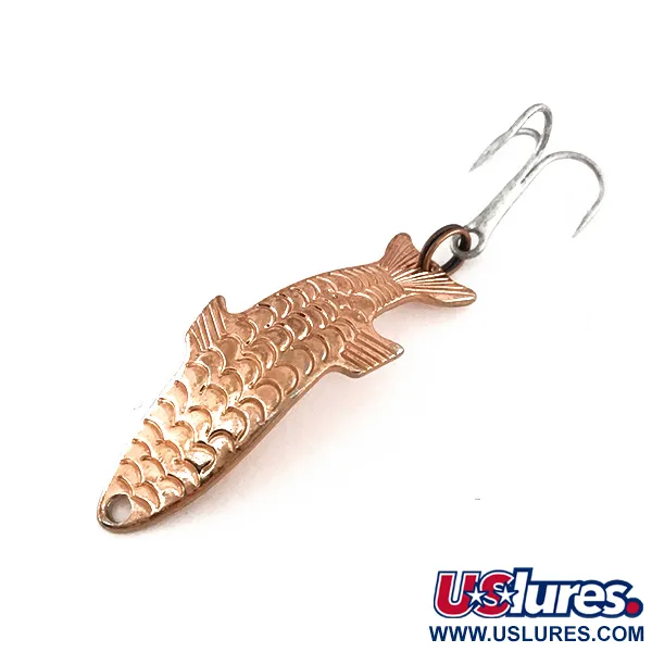 Gaufrée d'un motif d'écailles détaillé offrant une apparence tridimensionnelle réaliste, cette cuillère ondulante Acme est un véritable pan de l'histoire du matériel de pêche américain. Ce modèle, connu sous le nom de Phoebe et portant le code produit 7877, présente une élégante finition en cuivre sur sa longueur de 4 cm (1 1/2"). Pesant 4 g (1/8 oz), le corps incurvé du leurre comprend une nageoire dorsale distincte et une queue effilée, lui permettant d'être pêché efficacement aussi bien en surface qu'en profondeur. Sur le revers lisse, le nom « PHOEBE » est clairement frappé dans le métal, qui demeure dans un état 5/5. L'armement se compose d'un hameçon triple argenté et d'un anneau brisé à l'arrière, tandis qu'un trou percé avec précision à la tête est prêt pour votre attache.