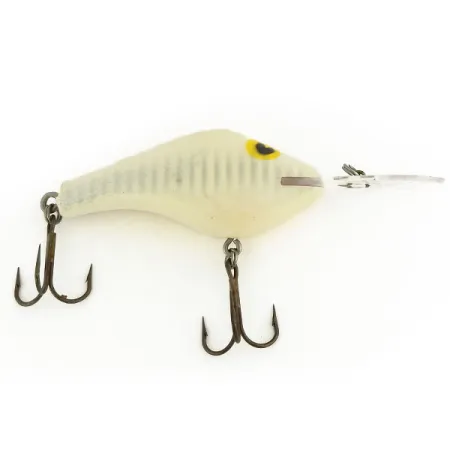 Taillé à la main dans du cèdre de qualité supérieure, ce spécimen illustre le savoir-faire classique de la marque californienne Poe's. Le corps présente un motif blanc et gris, caractérisé par de subtiles rayures verticales grises sur une base crème, accentué par des yeux jaunes distinctifs avec une pupille noire de style « pac-man ». Pesant 21 g (3/4 oz) et mesurant 8 cm (3 1/4"), ce Poe's Super Cedar (code produit 9721) est un leurre imposant conçu pour la profondeur. Une grande bavette de plongée en plastique transparent est solidement intégrée dans le nez, estampillée du nom du fabricant et équipée d'une attache robuste. L'armement comprend deux hameçons triples fixés par des anneaux brisés solides, tous les composants métalliques conservant un aspect propre. En termes de condition, le leurre est noté 4/5, ne montrant que de légères marques de manipulation tout en conservant l'intégrité de sa structure originale en cèdre. Fabriqués aux États-Unis, ces leurres étaient prisés par les pêcheurs pour la flottabilité spécifique et la résonance naturelle que seul le bois peut offrir.