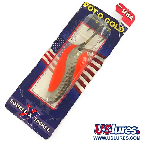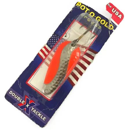 Le placage en nickel martelé offre l'éclat principal de cette cuillère ondulante Pot-O-Gold UV, bordée de sections orange fluorescent distinctes qui brillent sous la lumière UV. Pesant 1/2 oz (14 g), ce leurre de 2 1/4" (5,5 cm) a été fabriqué aux États-Unis par Rainbow Plastics et porte le code produit 4597. Il est à l'état neuf, toujours logé dans son emballage d'origine sur le thème « Double X Tackle » de Berthoud, Colorado. L'armement comprend un hameçon triple en acier à haute teneur en carbone fixé au corps martelé. Ce spécimen particulier met en avant la gamme « Specials », où des finitions réactives aux UV ont été intégrées pour aider les pêcheurs à cibler les poissons dans diverses conditions de luminosité. Le dos du carton liste des accessoires vintage courants comme l'Ajust-a-Bubble, illustrant la vaste famille de produits de ce fabricant américain.
