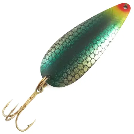 La peinture scintillante Blue Scale crée un effet nid d'abeille texturé sur l'avant de cette cuillère ondulante de 10,5 g (3/8 oz). Mesurant 6,5 cm (2 1/2"), le leurre est accentué par un point d'attaque rouge vif situé près de l'attache. Au dos, on retrouve les estampilles authentiques 'PRO SPOON' et 'USA' frappées dans le métal. La face convexe nickelée présente un éclat arc-en-ciel iridescent distinct. Identifié par le code produit 4528, ce modèle est en état 5/5, conservant ses surfaces métalliques propres et son hameçon triple d'origine.